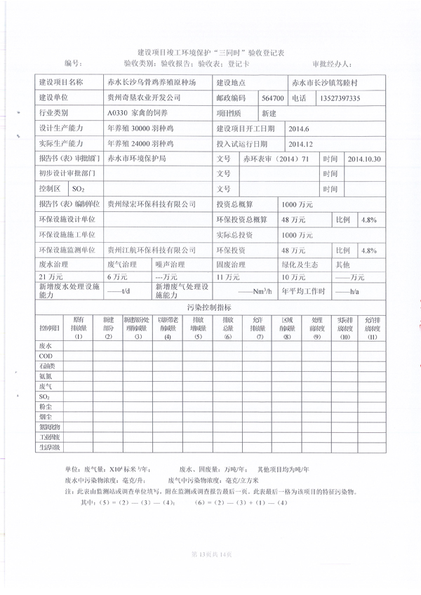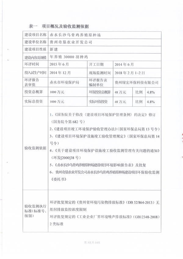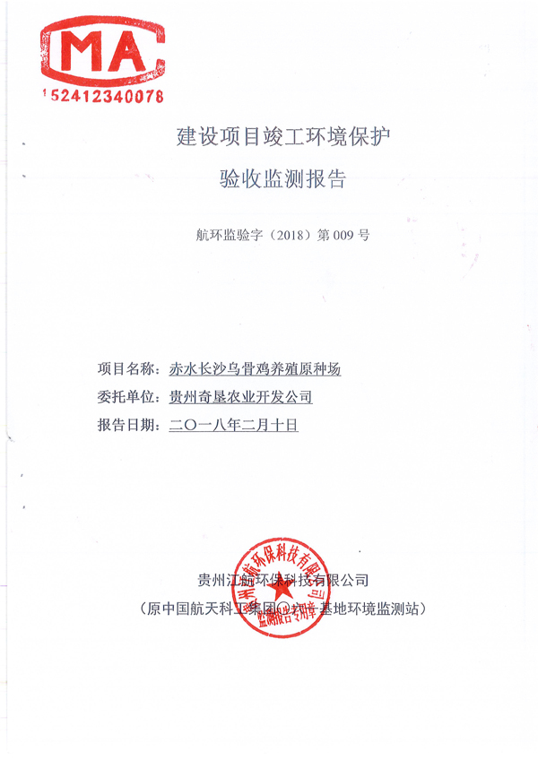 關于貴州奇墾農業開發有限公司赤水長沙烏骨雞養殖原種場驗收監測報告的公示