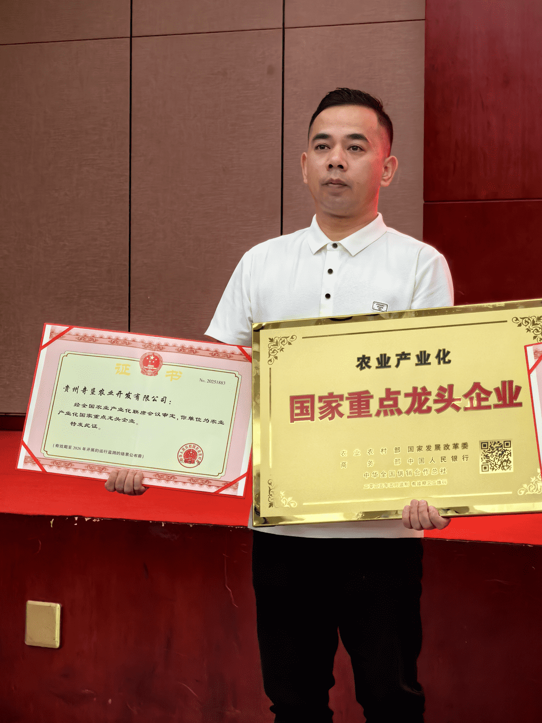 在頒獎現場,楊敏軍總監手捧“農業產業化國家重點龍頭企業”榮譽牌匾,這是由中國農業農村部、國家發展改革委等多部門聯合審定頒發,這不僅是企業的榮耀,更是貴州奇墾農業公司多年來深耕農業、帶動產業發展的肯定。